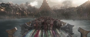 Thor returned to Asgard after two years of searching for the Infinity Stones. He discovered that Loki was still alive and disguising himself as Odin to rule Asgard.[3] The two traveled to Earth and with the help of Doctor Strange,[16] they found Odin in Norway. Before his death, Odin told his sons that their sister, Hela would be free and would try to rule Asgard by force. With Odin's death, Hela appeared before them and stated herself as their queen and destroyed Mjølnir. The three were transported via the Bifrost Bridge by Skurge, but Hela threw the two out of it and they landed on the planet of Sakaar.