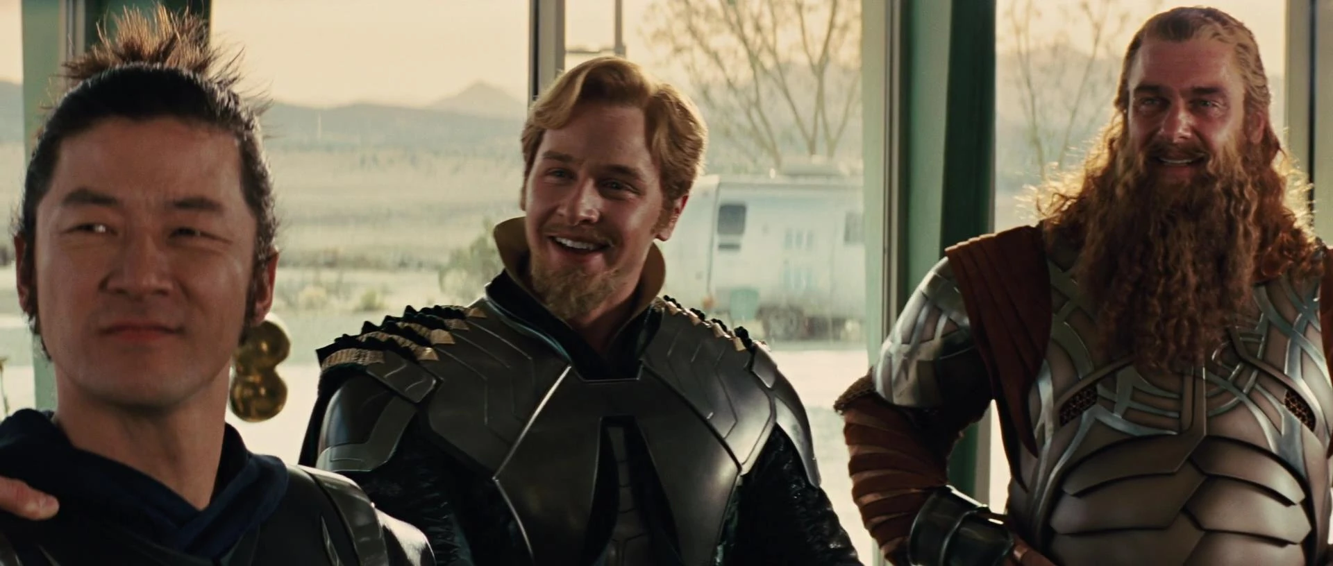 Going through the Bifrost, they soon arrived at Thor's last known location within Puente Antiguo and searched for their friend. As they walked through the town they attracted many strange looks from the locals due to their armor and weapons, with Hogun still carrying his own Hridgandr. Eventually they had managed found Thor with all of his new friends Jane Foster, Darcy Lewis and Erik Selvig, delighted to see one another again, the friends all hugged together.